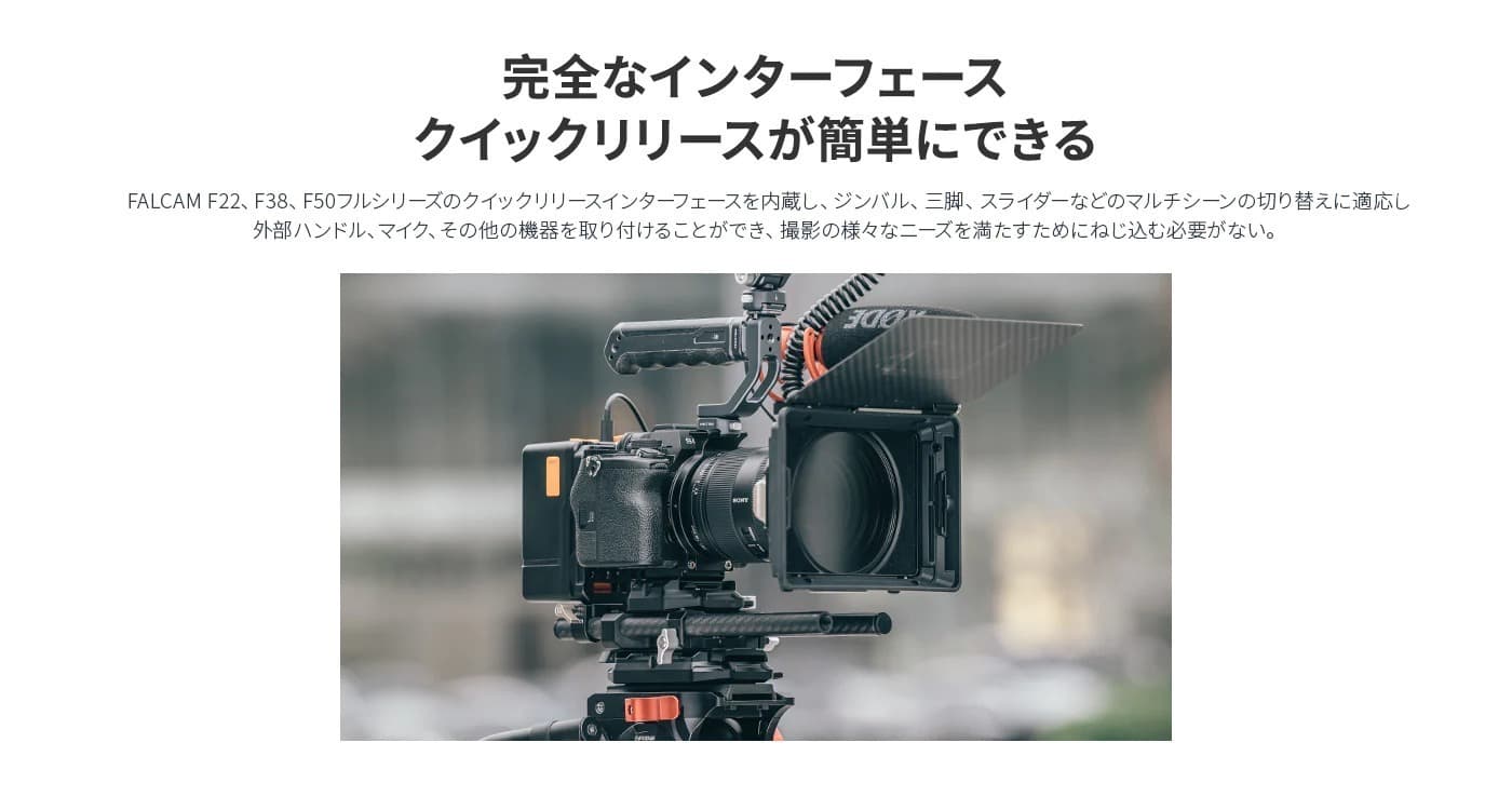 - 完全なインターフェース、簡単にクイックリリース: FALCAM F22、F38、F50フルシリーズのクイックリリースインターフェースを内蔵し、ジンバル、三脚、スライダーなどのマルチシーンの切り替えに適応します。