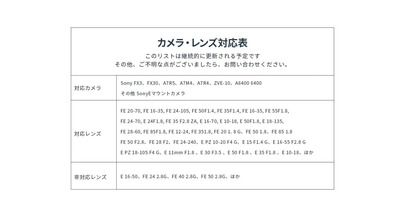 ・対応するカメラ:Sony FX3、FX30、A7R5、A7M4、A7R4、ZVE-10、A6400など、ソニーEマウントのカメラ