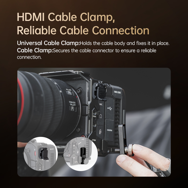 HDMIコネクタを固定するケーブルクランプと、ケーブル本体を固定するユニバーサルケーブルクランプを同梱。ケーブル抜けや接触不良を防ぎます。
