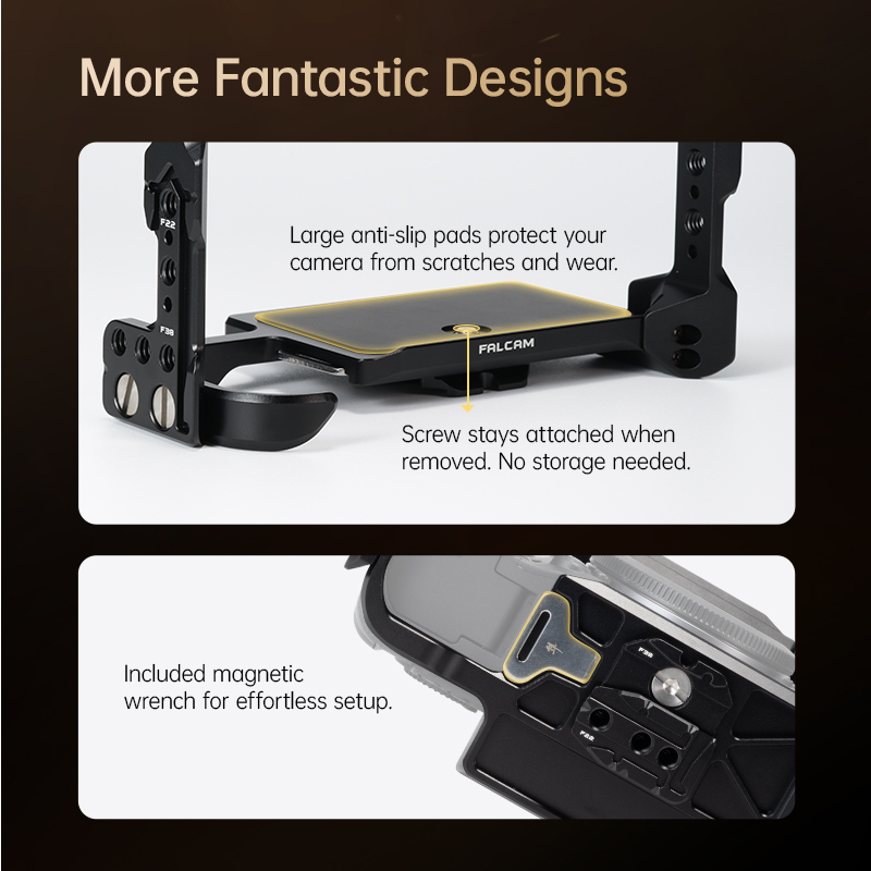 滑り止めパッドによりカメラのズレを防止。付属のマグネット式レンチにより、セットアップや調整をスムーズに行えます。
