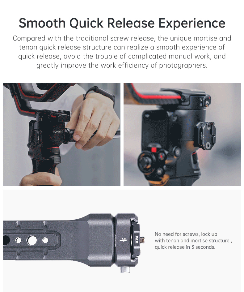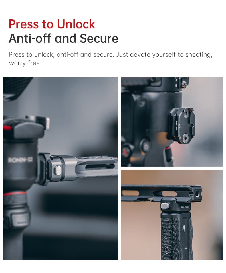 F22シリーズで初めて22mmのクイックリリースマウントを採用し、小型軽量化を実現。F22シリーズには、「押して取り付け、押して取り外し」につながるほぞ穴とほぞ構造の設計に従うだけでなく、一般的な機器アクセサリ用のクイックリリースシステムの完全なセットも含まれています。それをスピードアップする!スピード感あふれるクリエイティブな撮影をお楽しみください。