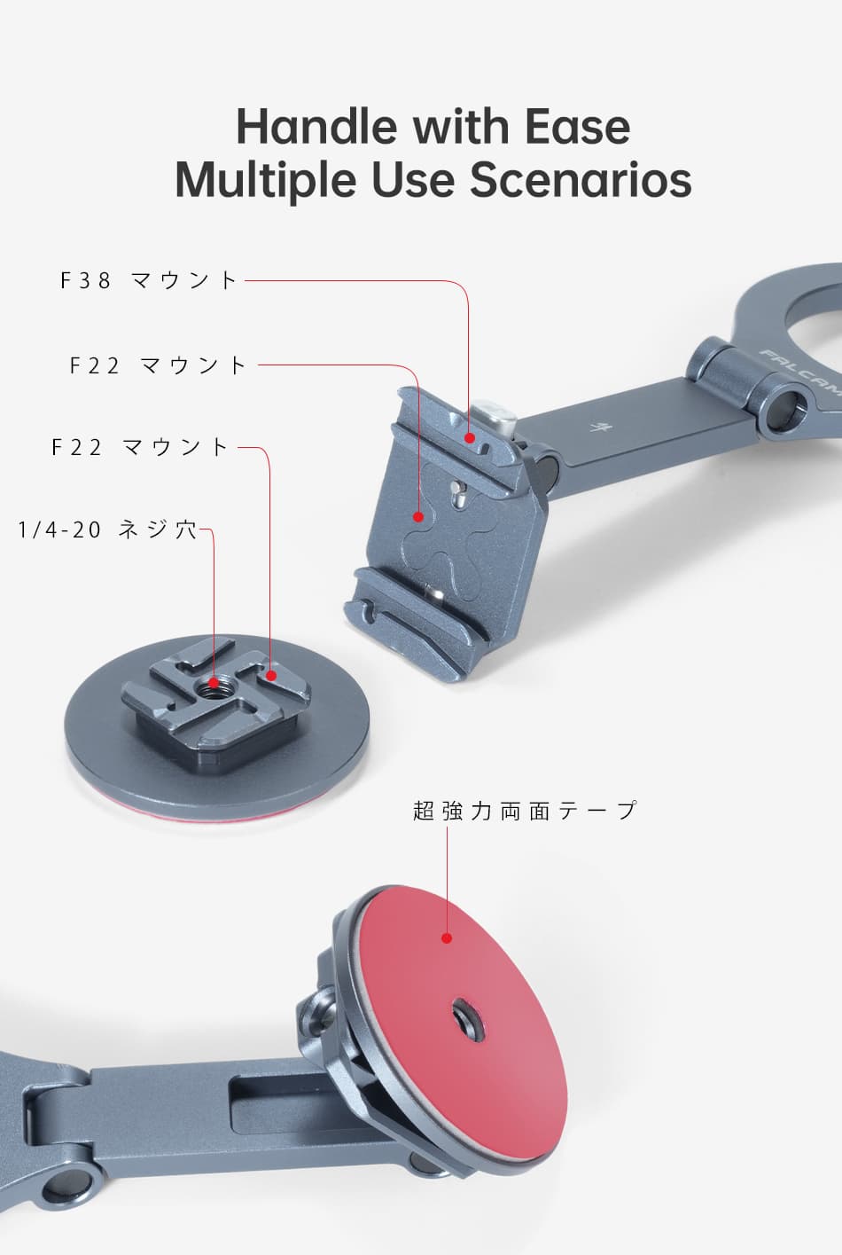 付属のプレートの上面部にはF22のオスプレートがあり、底面部は1/4-20ねじ穴と強力両面テープが装備されているのでさまざまな場所に取り付け可能。