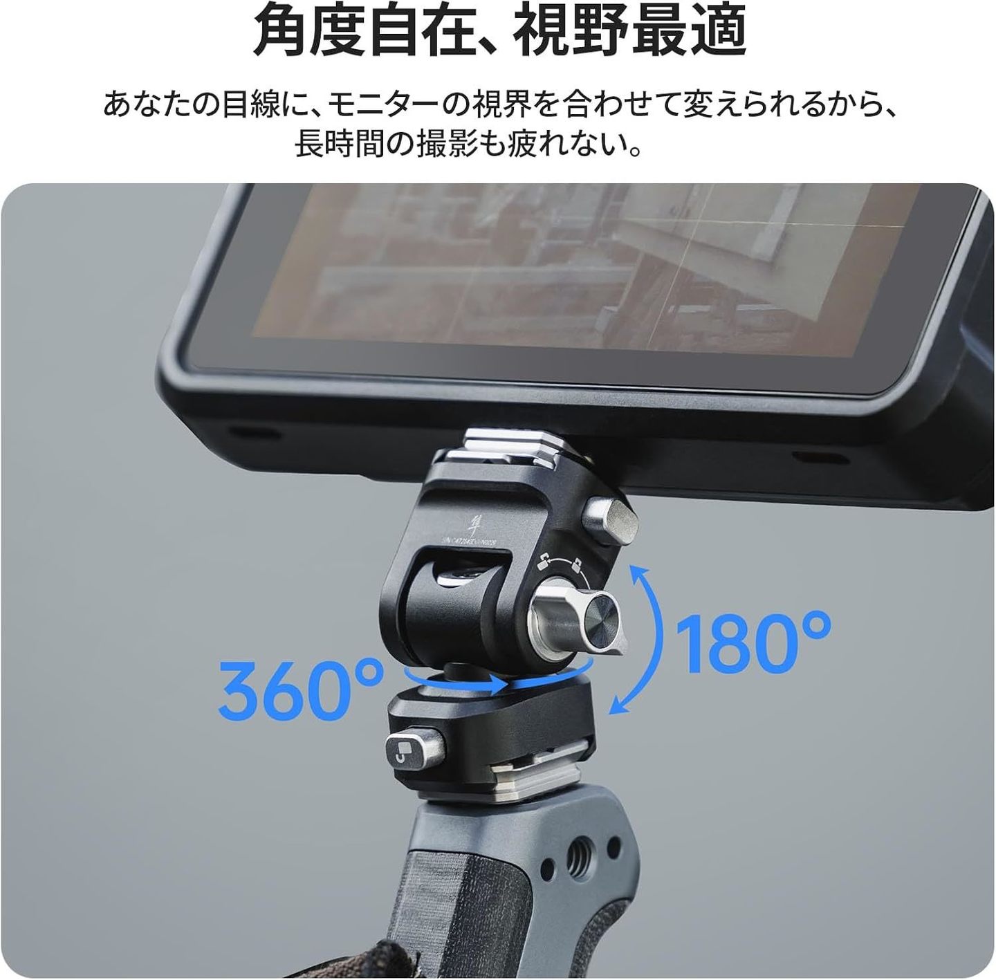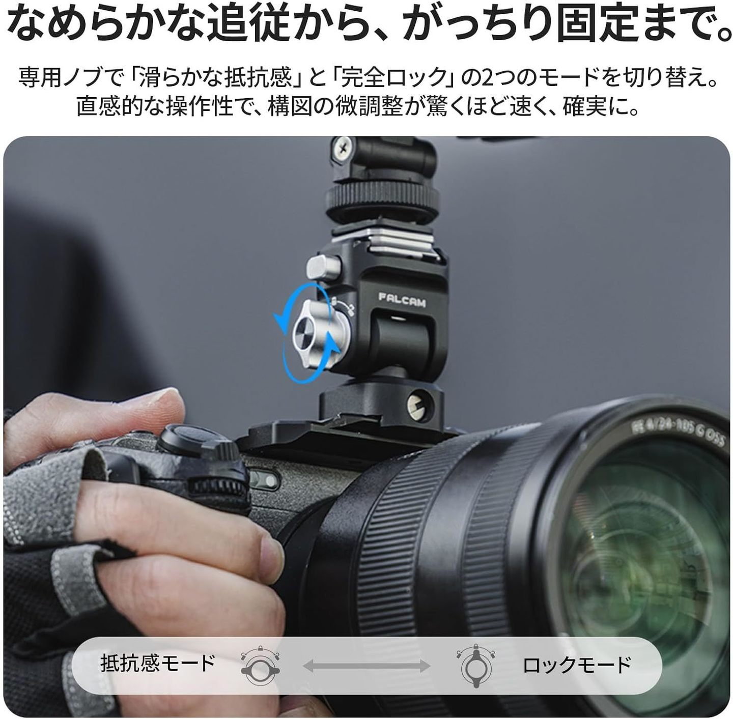 上下180°チルト、左右360°パンに対応。被写体や構図に合わせて自在にアングルを調整できます。刷新されたツインモードノブにより、横向きで「滑らかな抵抗モード」、縦向きで「完全ロックモード」に即切替。撮影中でも迷いなく一動作でモード変更が可能です。