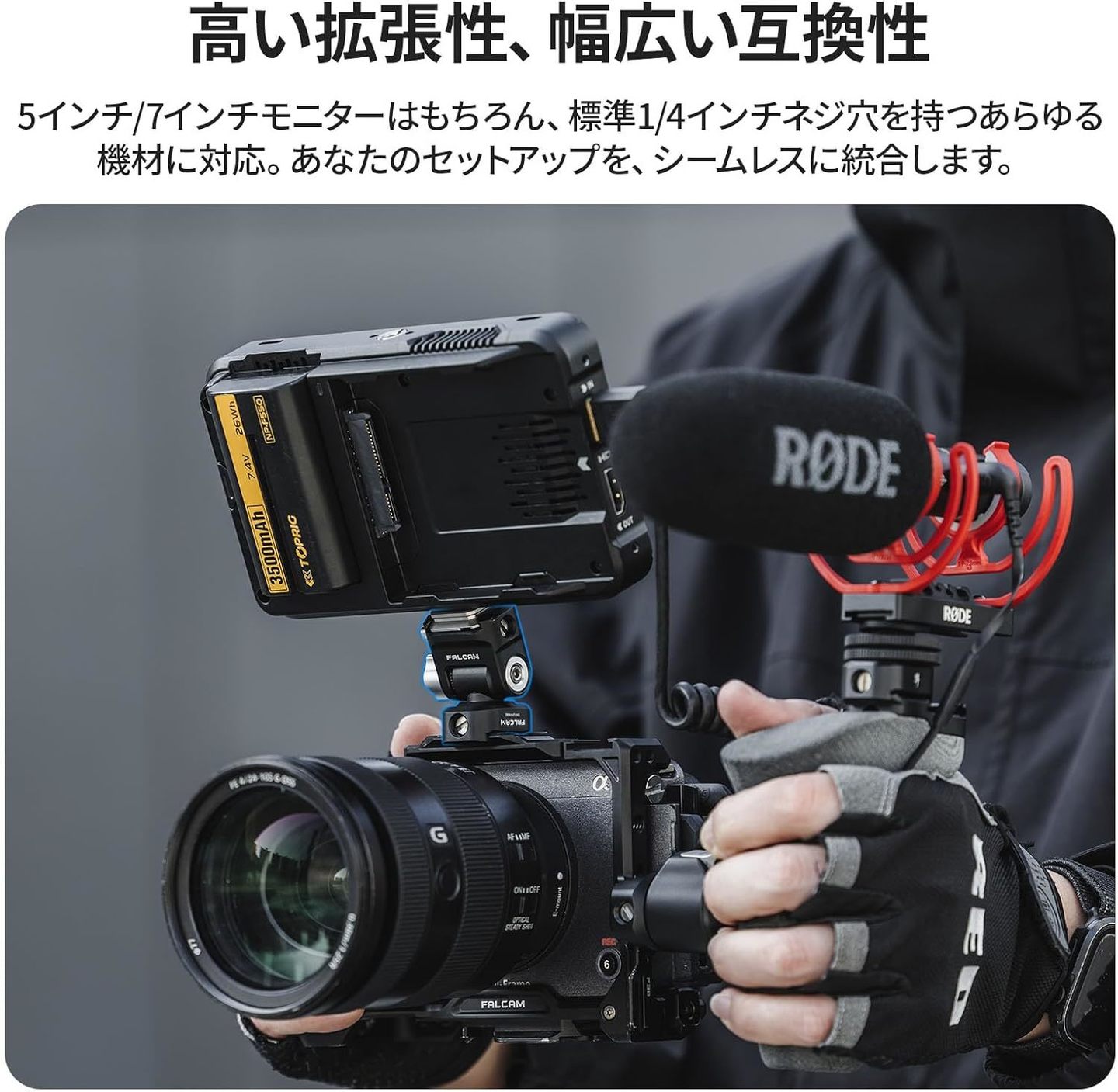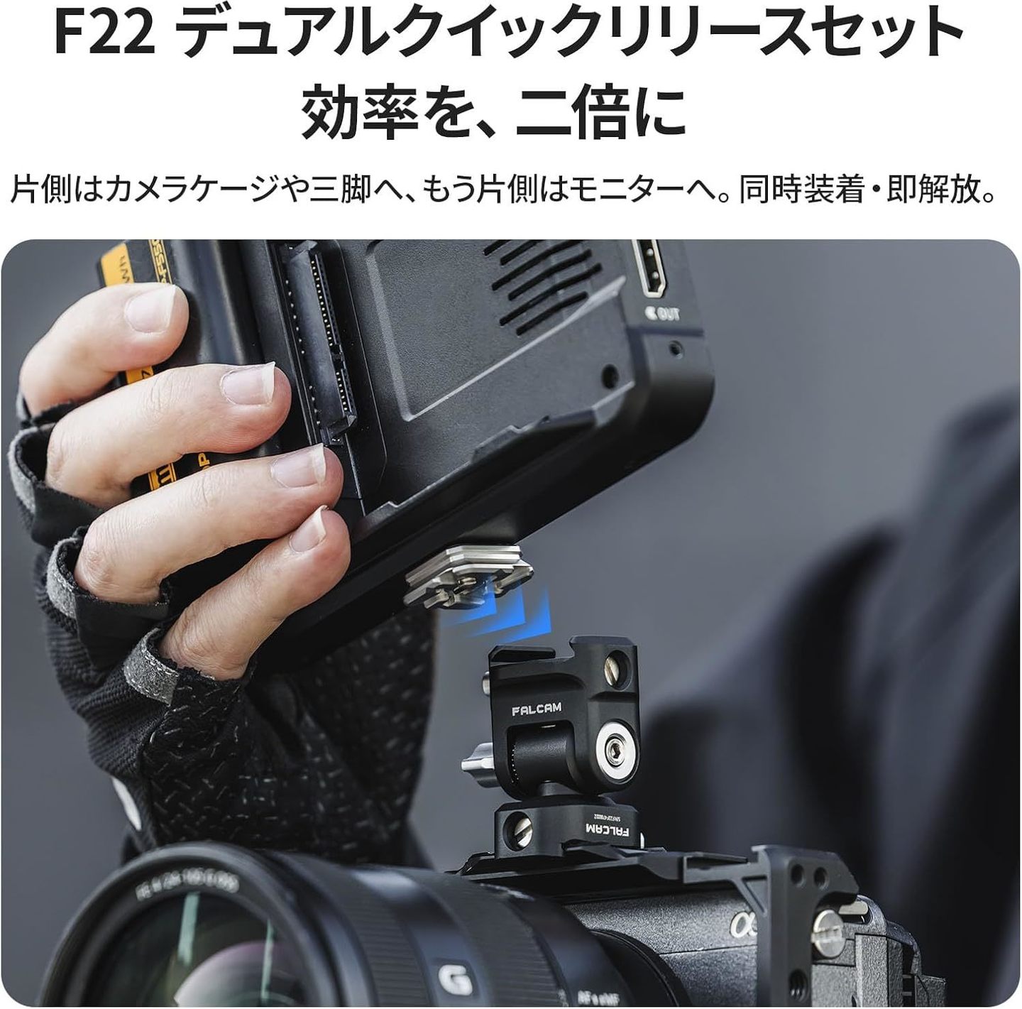 上下2段のF22マウントを備えたデュアル構造。機材を同時に固定しながら、必要な側だけを即座に取り外しが可能です。セッティングを崩さず、撮影スタイルを素早く切り替えられます。