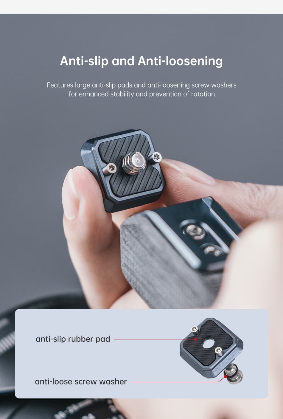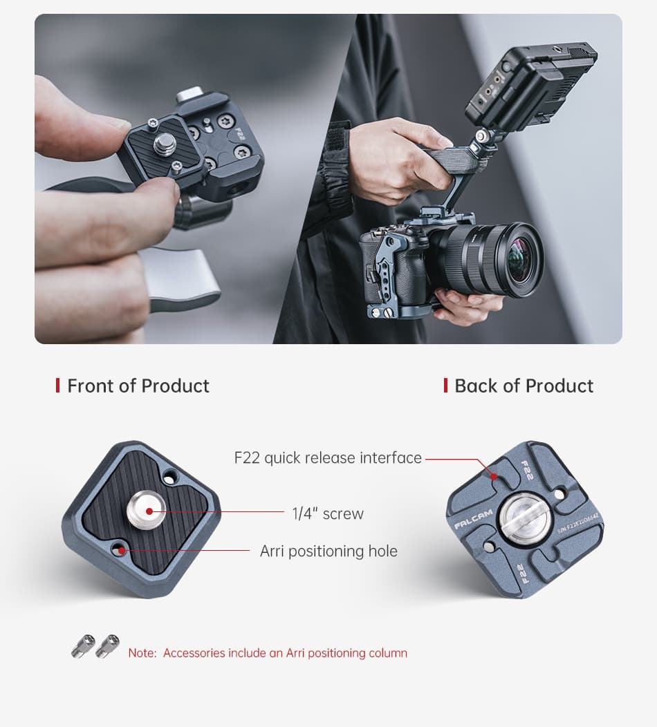 F22のベーシックなクイックリリースプレートは、ほぞ穴構造で製造され、F22シリーズのアクセサリーを使用することで、機器の切り替えが簡単に行えるようになります。