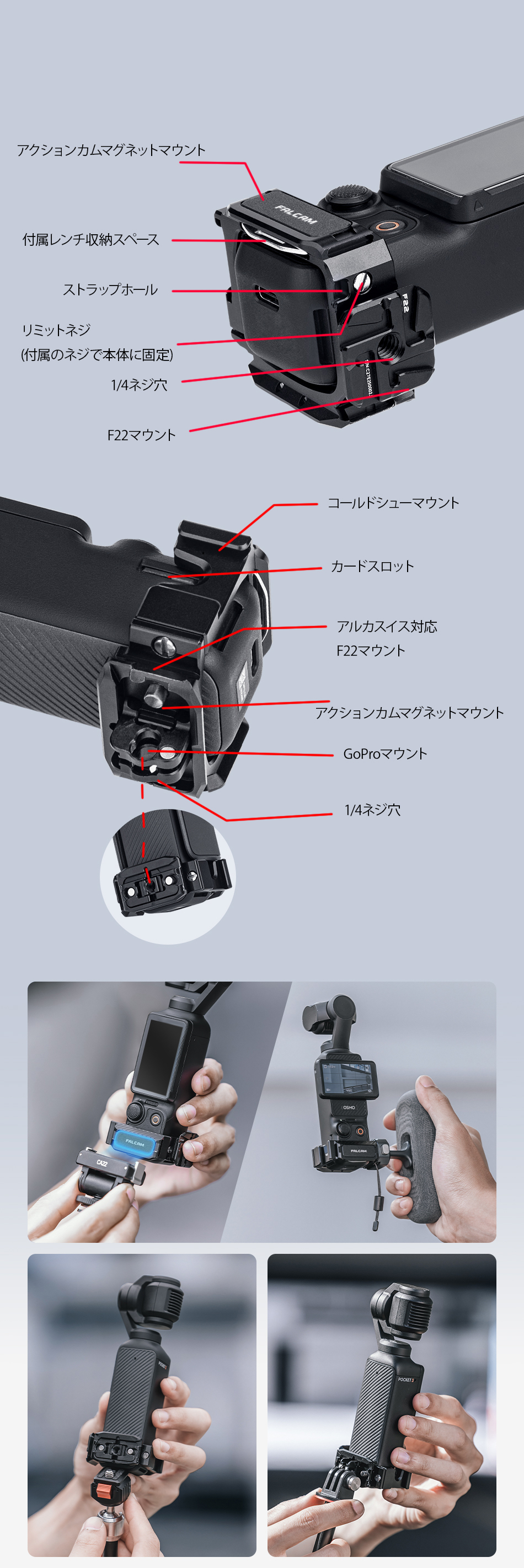 F22マウント、マグネットマウント、アクションカムマウント、1/4ねじ、コールドシューマウントが装備されているので、お客様の使用状況を変えずに追加することができます。