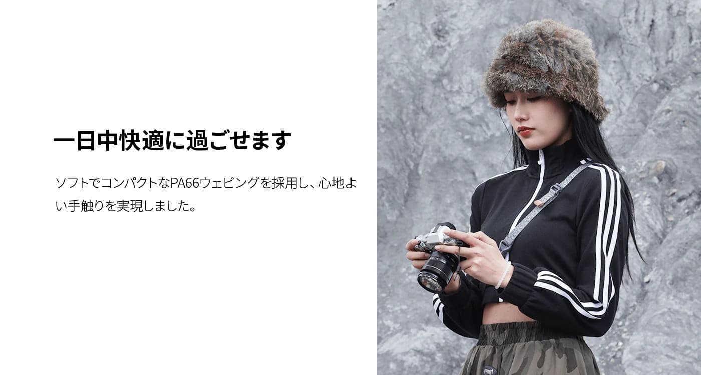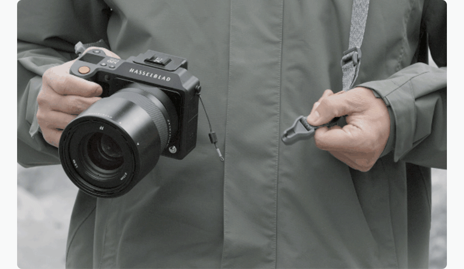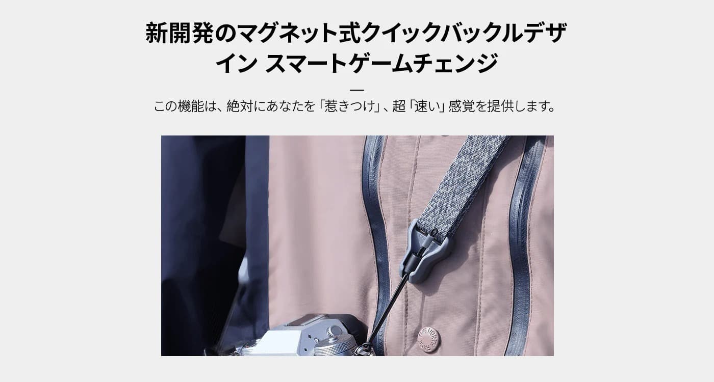 - 新デザインのマグネット式クイックバックル: マグネットを内蔵したクイックバックルは、ショルダーストラップを収納することなく、カメラを取り外すことができます