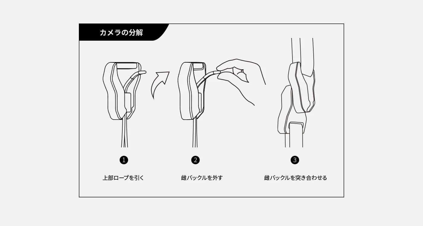 - 新デザインのマグネット式クイックバックル: マグネットを内蔵したクイックバックルは、ショルダーストラップを収納することなく、カメラを取り外すことができます