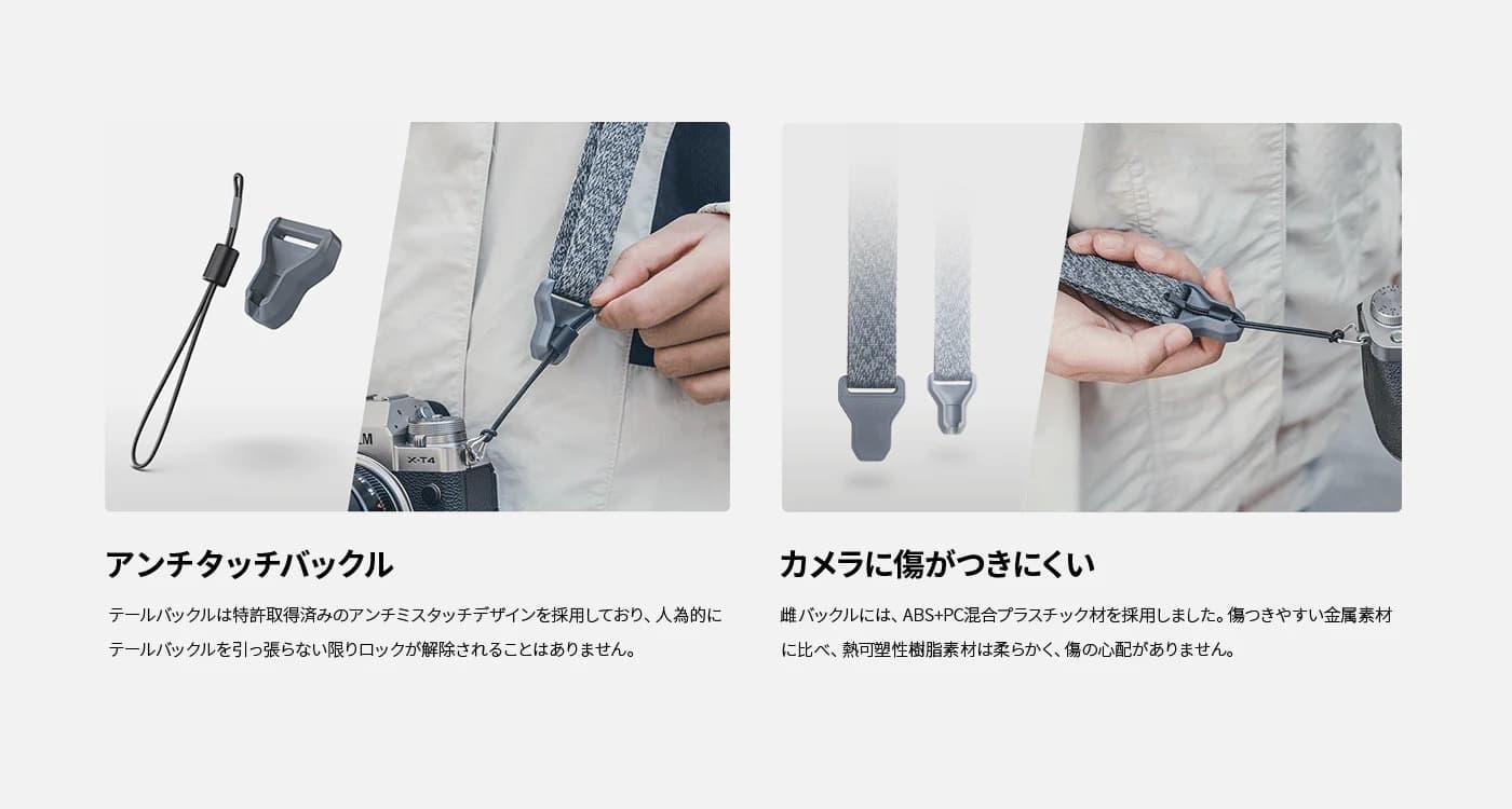 - カメラにキズがつきにくい: メスバックルはABS+PC混合プラスチック材質で作られています。