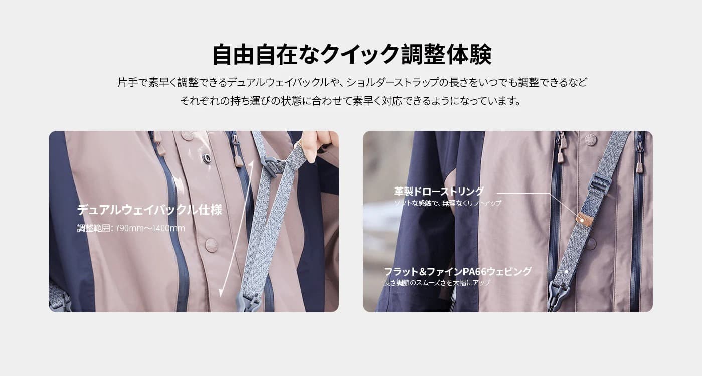 - 自由自在なクイックアジャストメント体験: 2つのクイックプルアジャスターによって可能になった、膨大な長さ調節の範囲