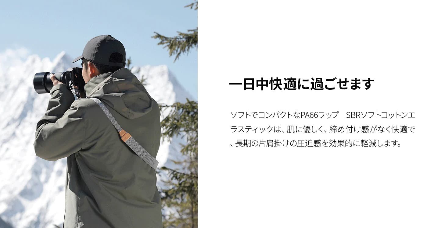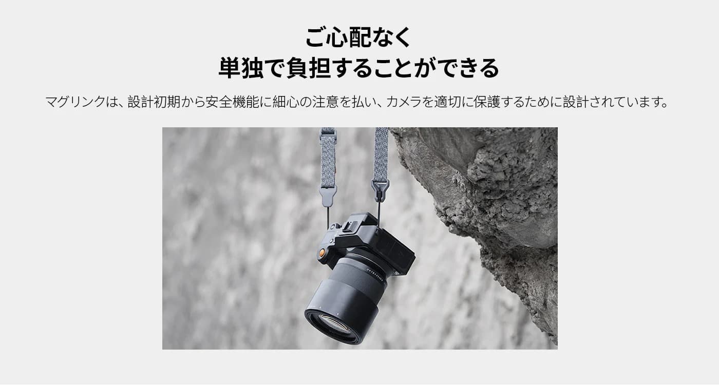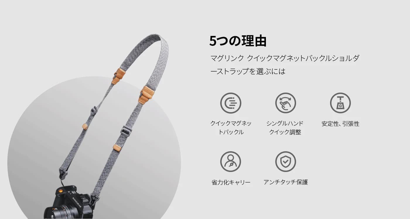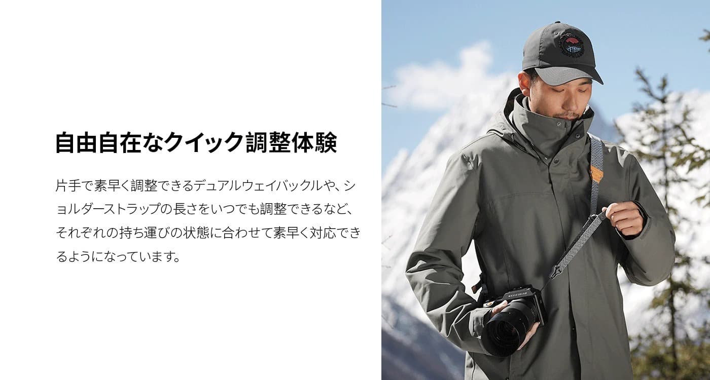 - 新デザインのマグネット式クイックバックル: マグネットを内蔵したクイックバックルは、ショルダーストラップを収納することなく、カメラを取り外すことができます