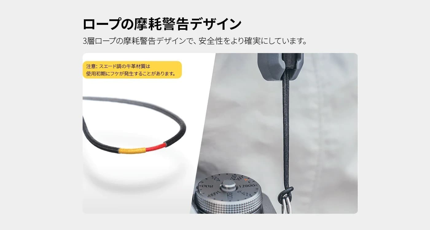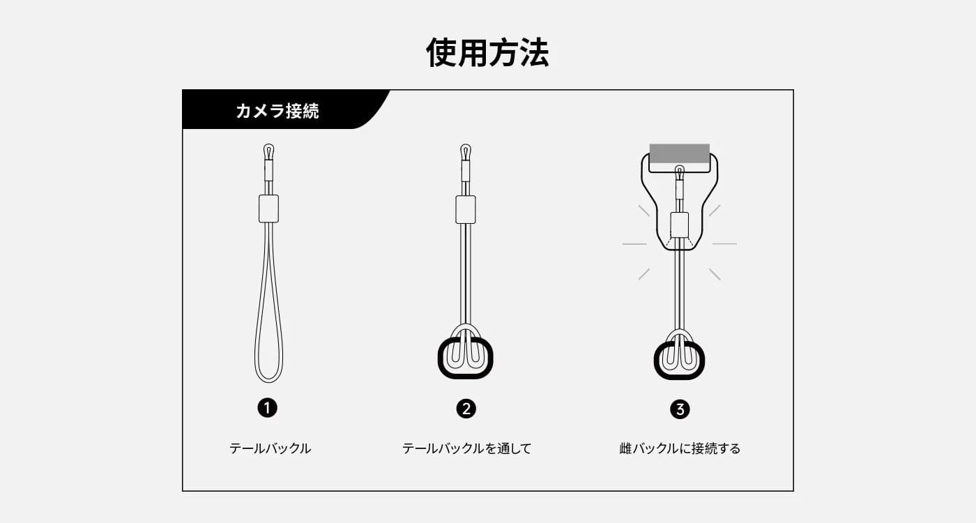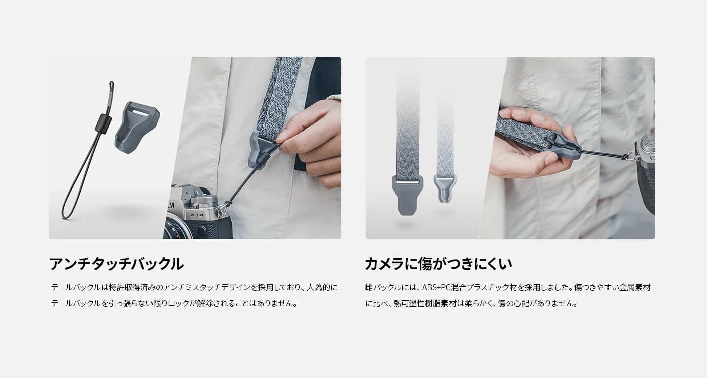 - カメラにキズがつきにくい: メスバックルはABS+PC混合プラスチック材質で作られています。