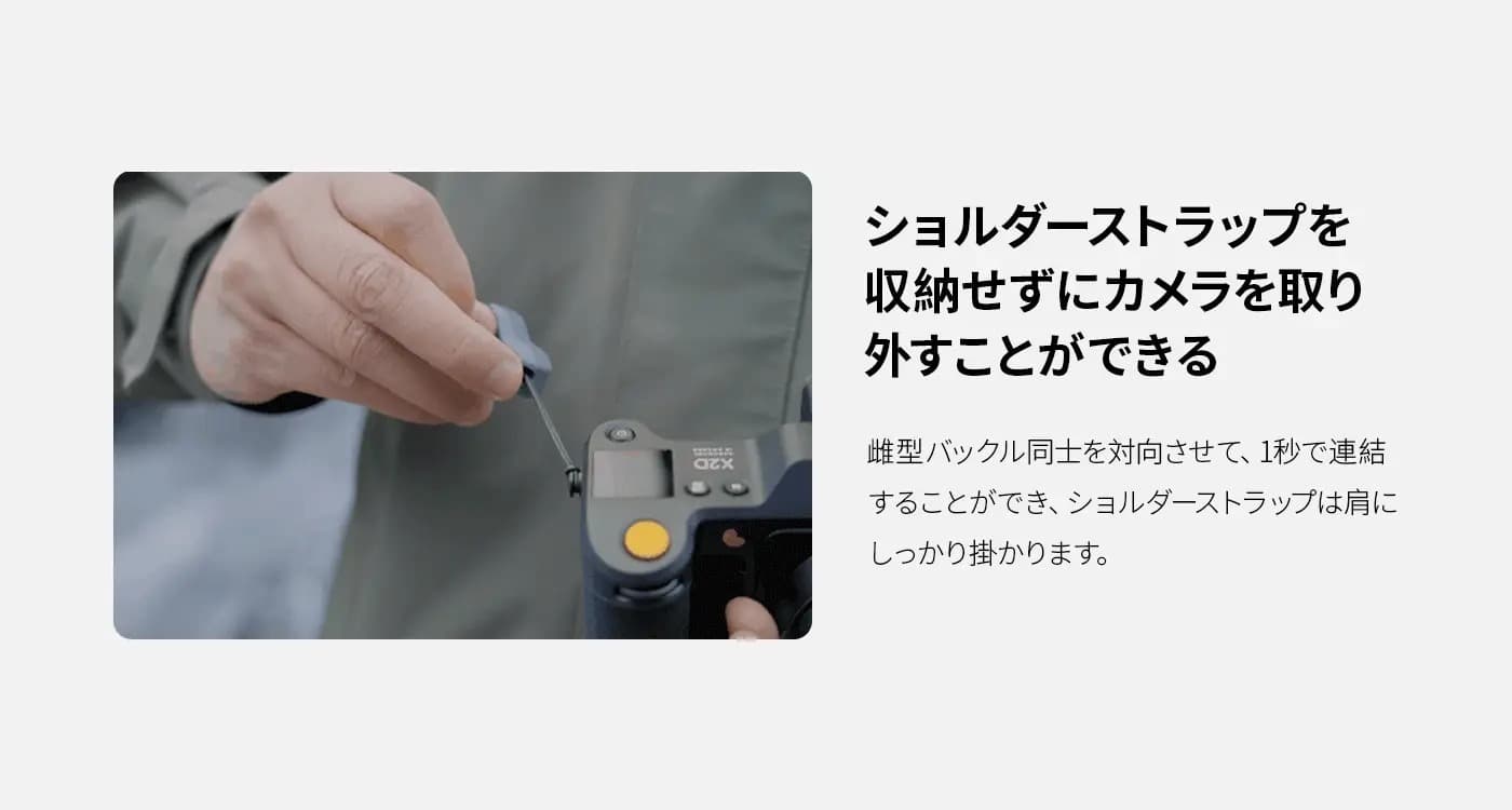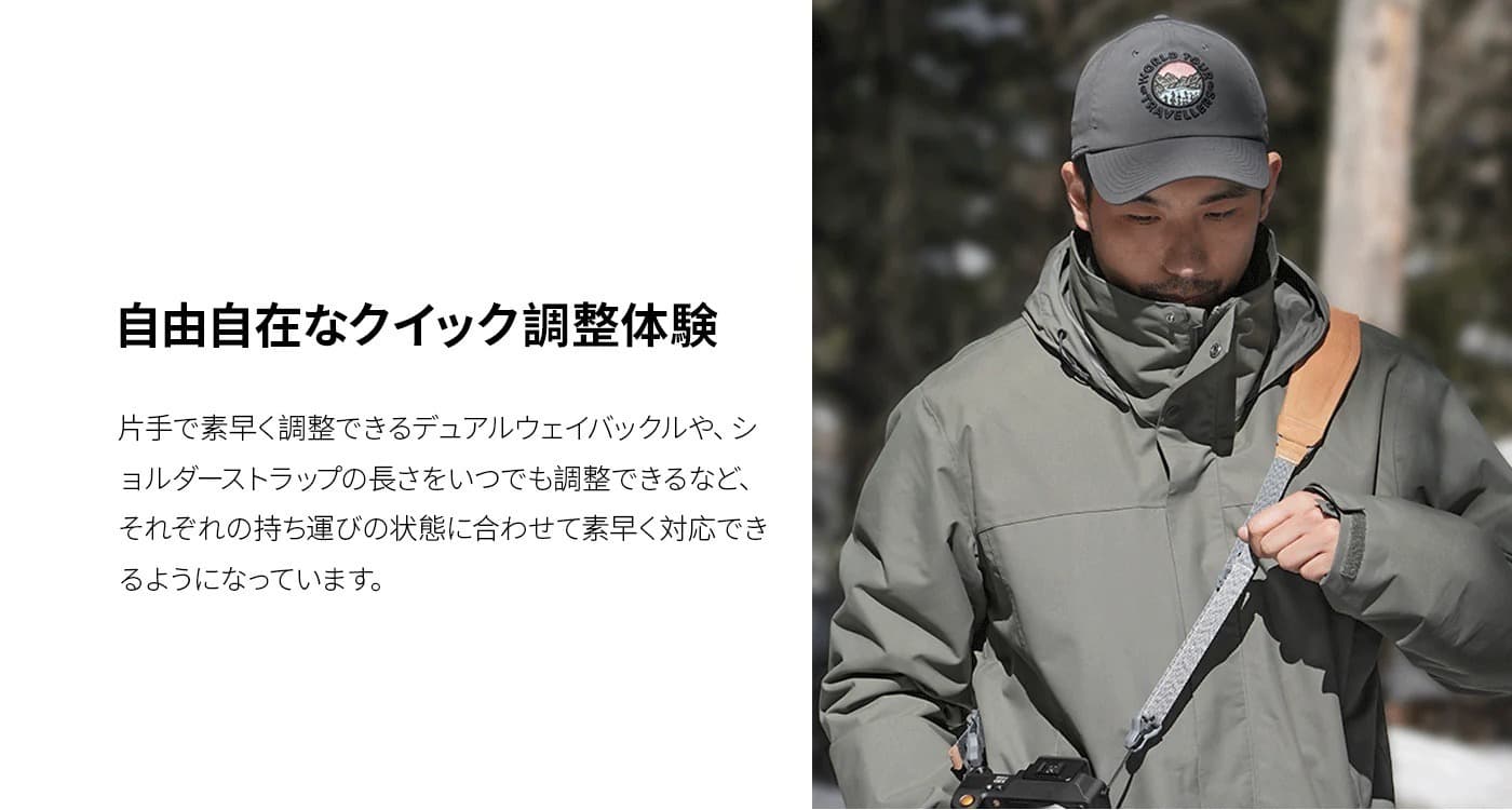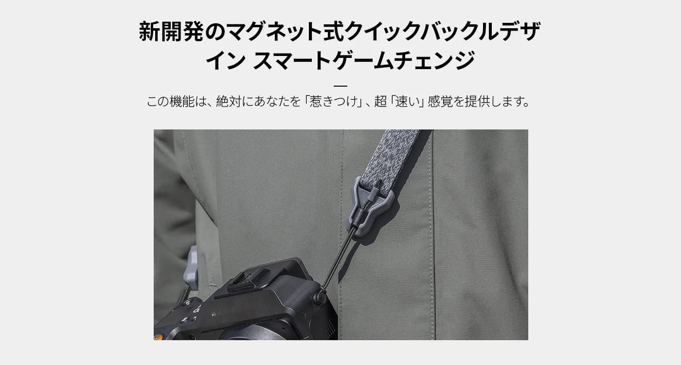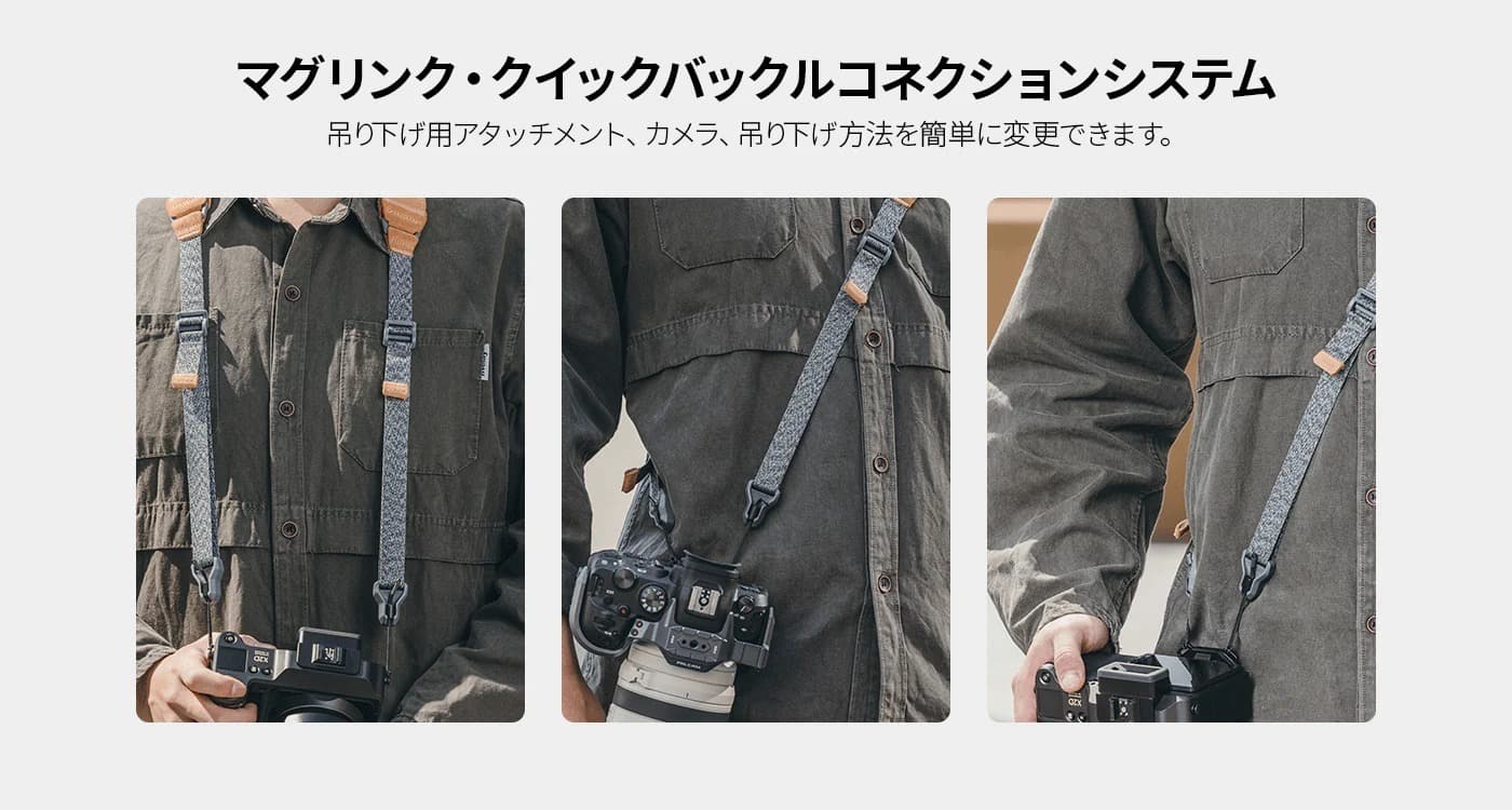 - マグネット式クイックバックル: マグネットを内蔵したクイックバックルは、ショルダーストラップをマグネットでくっつけることで、ストラップを収納する手間なく、カメラを取り外すことができます。