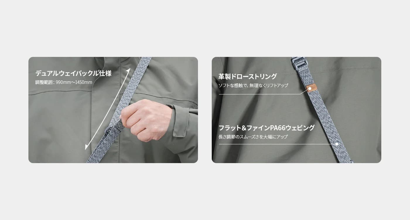 - 自由自在なクイックアジャストメント体験: 2つのクイックプルアジャスターによって可能になった、膨大な長さ調節の範囲
